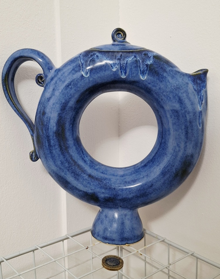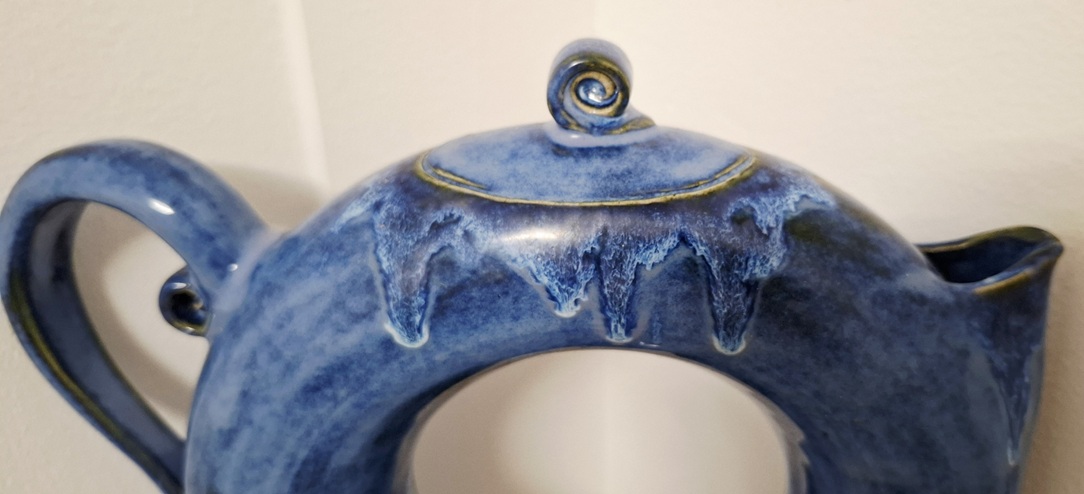 Bold, sculptural, and impossible to overlook. This decorative ceramic teapot sculpture in deep oceanic blue captures movement and flow in clay. With its hollow circular form, spiral finial, and cascading glaze drips, it evokes both modern design and natural inspiration.